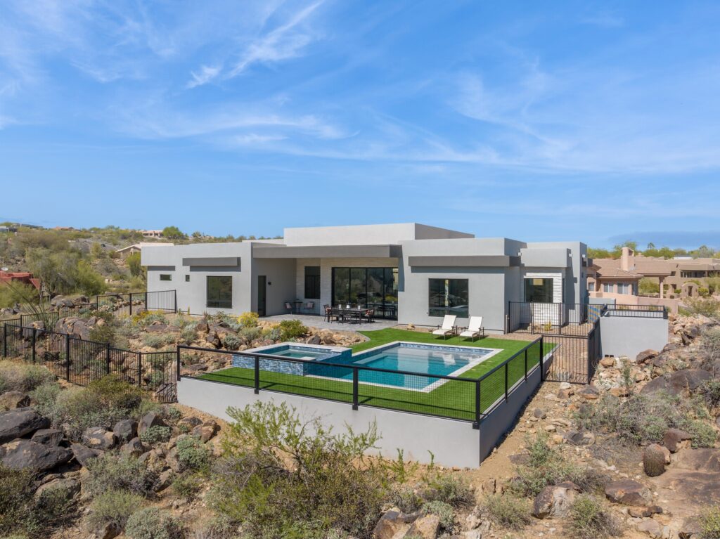 Contemporary Southwest home on .86 acres with big views of McDowell Mountains, Fountain & Superstition Mountains. Backs to stunning boulder arroyo for a great private backyard. Enjoy open, view-oriented plan featuring 16′ x 10′ stacking doors that lead to the outdoors from a stunning Great Room with 60″ fireplace and 8′ interior doors.